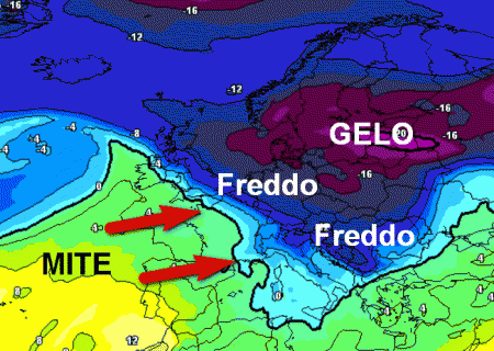Il gelo resterà arroccato sui Paesi dell’Europa nord-orientale, proponendo un piccolo lembo verso le regioni settentrionali e adriatiche con isoterme comprese tra -4 e -6° a 1500 metri.