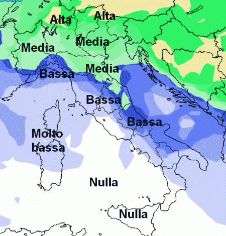 La medesima probabilità risulterà più elevata, attorno al 50 – 60% in prossimità dei settori alpini centro-orentali, mentre sarà bassa o molto bassa sul restante territorio nazionale.