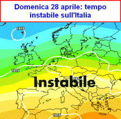 La media degli scenari valida per domenica 28 aprile mostra una situazione di elevata instabilità con rischio di piogge e rovesci su buona parte dell’Italia, specie al nord e al centro.