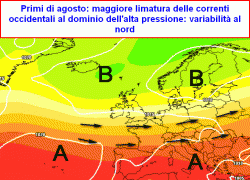 E’ vero: il Mediterraneo rimarrà per giorni abbracciato da aria piuttosto calda e stabile, ma una corrente da ovest troppo tesa, prima o poi nella seconda parte dell’estate finisce per abbassarsi di latitudine con il trascorrere dei giorni e quando il divario termico tra il nord e