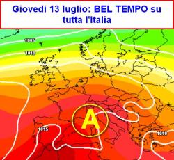 A seguire, l’alta pressione chiuderà tutti i varchi e tra mercoledì 12 fino a sabato 15 luglio il bel tempo sarà esteso a tutta la nostra Penisola, senza eccezioni (seconda mappa).