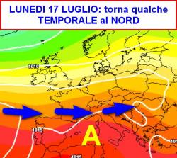 Nella giornata di lunedì 17 luglio (terza mappa) tornerà qualche temporale al nord sotto l’egida di correnti occidentali meno calde.