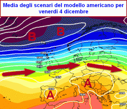 La media degli scenari proposta oggi dal modello americano per il 4 dicembre (riassunta nella prima mappa), propende per un tiraggio esasperato del getto atlantico sul centro-nord Europa (frecce rosse) con l’inevitabile distensione dell’alta pressione delle Azzorre verso il Mediterraneo e l’Italia.