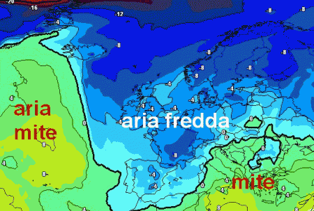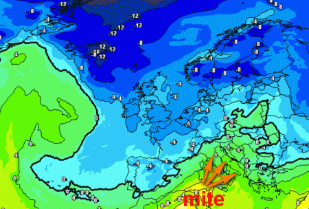 Il dilemma sta proprio nel complemento di tempo (o quantitativo di durata): "per qualche ora": infatti tutto ciò sottende l’azione di venti miti sciroccali in grado di mangiarsi in breve tempo tutto il freddo affluito nelle ore precedenti sul nostro Paese, perchè si accoglie l’ipotesi di una saccatura che scende decisamente ad ovest sul Continente, portando il freddo solo sulla Francia, ecco infatti le temperature previste a 1500m per l’alba di martedi 29 dicembre se passasse questa ipotesi, non rimarrebbe quasi nulla del freddo: