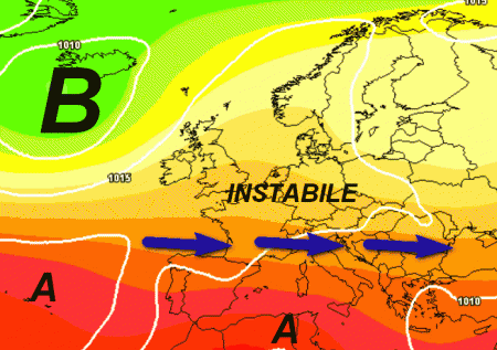 Ecco le correnti instabili atlantiche (frecce blu) interessare il settentrione e parte delle regioni centrali con situazioni temporalesche più o meno intense associate a cali termici. Al sud e sulle Isole, invece, dominerà una situazione nettamente più stabile e moderatamente calda.