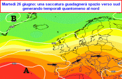 martedì 26 giugno: segni di cedimento dell’alta pressione con temporali più organizzati su Alpi, Prealpi ed alte pianure del nord con annesso calo termico, solo blandi passaggi nuvolosi altrove e ancora caldo.