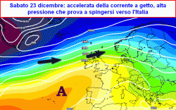 giovedì 21 dicembre, venerdì 22 dicembre e sabato 23 dicembre: graduale inserimento dell’alta pressione da ovest e solo un po’ di variabilità sulle regioni alpine di confine e lungo l’Adriatico, ma senza fenomeni di rilievo.
