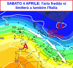 Sembra al momento scongiurato il "guasto freddo" previsto qualche giorno fa tra Venerdì Santo e sabato 4 aprile. L'alta pressione, tuttavia, potrebbe nuovamente sbilanciarsi verso nord-ovest, consentendo l'arrivo di correnti più fredde da nord-est sulla nostra Penisola.