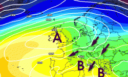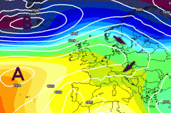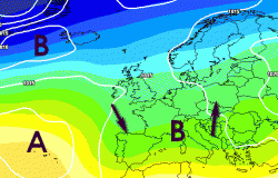 Il modello europeo non segnala un inserimento delle correnti fredde cosi deciso nella sua media degli scenari prevista per lo stesso giorno, ma comunque abbozza un rientro di correnti da nord-est, in grado di generare un po’ di instabilità atmosferica.