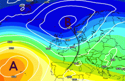 La saccatura che accompagna il fronte proposta dal modello americano, che vediamo qui sotto sempre durante lo stesso intervallo temporale, non pare particolarmente incisiva, ma forse potrebbe servire a modificare, cioè a deformare tutta la struttura della perturbazione in avvicinamento fino a consentirgli un ingresso sul nostro territorio.