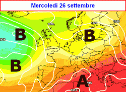 Volgendo lo sguardo oltre e arrivando a mercoledi 26 settembre (terza mappa), notiamo le regioni settentrionali e centrali alle prese con un tempo molto instabile e più fresco.
