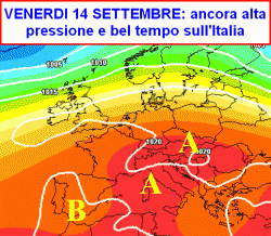 La mappa relativa a venerdì 14 settembre (ma la mappa per sabato 15 è molto simile), mostra l’alta pressione ben salda sull’Italia con un promontorio abbastanza solido che dal nord Africa si protenderà verso nord, fino a lambire l’Europa centrale.
