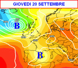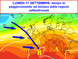 I primi attacchi all’alta pressione ad opera delle perturbazioni atlantiche potrebbe avvenire a partire da lunedi 17 settembre (seconda mappa).