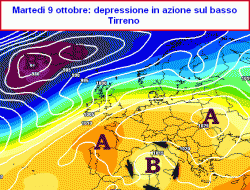 martedì 9 ottobre: bel tempo al nord, depressione in azione al centro e al sud con nuvolaglia e qualche precipitazione sparsa, anche a carattere temporalesco. Temperature miti.