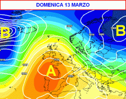 La prima cartina ci mostra la situazione attesa in Italia per domenica 13 marzo. Il centro dell’alta pressione sarà posizionato sul Golfo di Biscaglia, ma il suo influsso stabilizzante si estenderà molto bene a gran parte dell’Europa centrale e al nostro Paese.