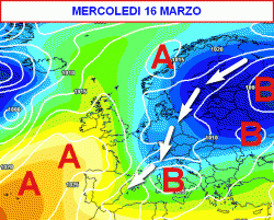 La seconda mappa ci mostra l’evoluzione prevista in Italia per la giornata di mercoledì 16 marzo.