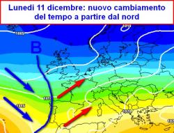 La seconda mappa valida per lunedi 11 dicembre mostra l’avvicinamento di una saccatura da ovest foriera di maltempo ad iniziare dal settori di ponente e dal nord.