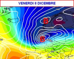 La prima mappa valida per il giorno dell’Immacolata (venerdì 8 dicembre) mostra un tentativo di affondo perturbato da nord verso il bacino centrale del Mediterraneo, con rischio di tempo instabile e più freddo specie al nord e al centro.