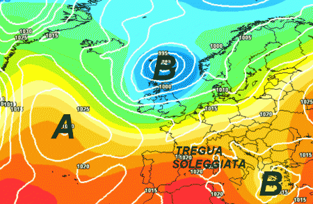Notiamo una situazione di intervallo tra una depressione che uscirà di scena dall’Italia (in basso a destra) ed una nuova figura di maltempo che impegnerà l’Europa nei giorni successivi (in alto a sinistra).