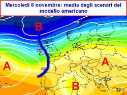 La media degli scenari del modello americano ci aiuta a fare maggiore chiarezza, lasciando sempre (e ovviamente) un certo margine di incertezza; in altre parole, l’elaborato di oltre oceano nei suoi quadri ens mostra la formazione di un canale depressionario che dall’Europa occidentale potrebbe dipartirsi verso il Mediterraneo e l’Italia.
