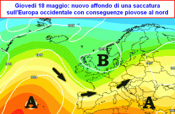 Questa fase durerà una manciata di giorni, perché entro giovedì 18 maggio una nuova saccatura si farà strada dal nord Europa andando a collocarsi sull’ovest del Continente, consegnandoci da sud ovest aria instabile, tempo piovoso al nord e in parte anche sulle regioni centrali tirreniche, molto meno sulle centrali adriatiche, grazie alla schermatura dell’Appennino, inizialmente nessun cambiamento al sud.