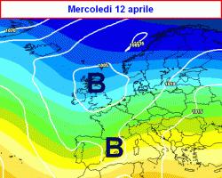 La media degli scenari prevista per mercoledì 12 aprile (terza mappa) mostra una situazione di deciso maltempo per le nostre regioni settentrionali, con piogge anche intense e temporali.
