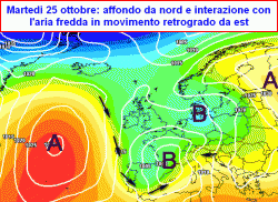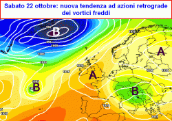 In pratica entro martedì 25 ottobre tornerebbe a riproporsi una fase di maltempo simile a quella che stiamo per sperimentare e subito dopo, non contento, il tempo ci offrirebbe ulteriori affondi freddi e perturbati dal nord Europa, con le alte