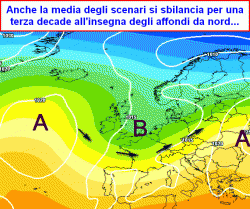 un’analisi che riassuma 20 emissioni: vedete chiaramente qui a fianco come la circolazione sull’Europa risulti meridiana e non certo zonale, come si vede in quasi tutte le emissioni in questo tipo di analisi.