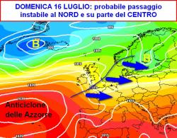La prima mappa, valida per domenica 16 luglio, mostra l’alta pressione africana ormai rintanata nei sui territori di origine e surclassata da un anticiclone azzorriano davvero in forma! Le correnti più fresche ed instabili da ovest accenderanno diversi temporali al nord e nelle zone interne del centro, mentre lasceranno indenni le regioni meridionali e le isole.