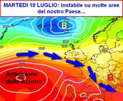 La mappa di previsione valida per martedì 18 luglio mostra una situazione fresca e potenzialmente instabile soprattutto sulle nostre regioni centro-settentrionali.