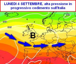 Volgendo lo sguardo a prua e arrivando a lunedì 4 settembre (seconda mappa), pare evidente lo sfondamento delle correnti atlantiche ai danni di un’alta pressione ormai con il fiato corto.