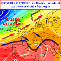 Alta pressione sì, ma con alcune falle che mineranno la sua stabilità. Una di queste è raffigurata nella prima cartina, che riguarda la situazione sinottica attesa per giovedì 2 ottobre in Italia.