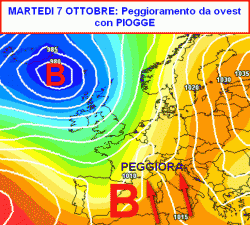 La seconda cartina che abbiamo preparato inquadra la situazione attesa in Italia e in Europa per la giornata di martedì 7 ottobre.