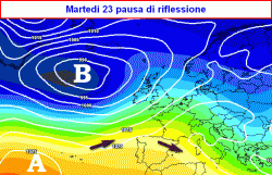 Si sta cercando di capire se il guasto del 20 andrà veramente in porto, ma in ogni caso per martedì 23 ci sarà una pausa, che potrebbe venir interrotta dall’ingresso di un’altra saccatura tra mercoledì 24 e venerdì 26 con altre precipitazioni, nevose però solo in montagna.