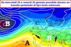 tra mercoledì 24 e venerdì 26 gennaio: possibile peggioramento da ovest con piogge e nevicate sulle Alpi oltre gli 800-900m, sull’Appennino centro-settentrionale oltre i 1200m. Piogge meno probabili al sud. Temperature in calo al nord, in rialzo altrove, specie al sud.