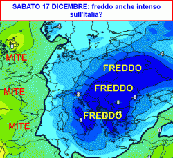 La prima mappa, valida per sabato 17 dicembre, mostra la mitezza arroccata sui settori più occidentali del Continente. La parte centrale e orientale europea, compresa l’Italia, risulterebbe invece inglobata all’interno di una massa fredda non indifferente, anche se i massimi effetti si farebbero sentire sui Paesi dell’Europa orientale.