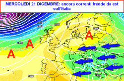 Ecco la mappa relativa alla giornata di mercoledì 21 dicembre. Anche in questo frangente, il freddo potrebbe farsi sentire in Italia, con fenomeni nevosi a quote alquanto basse, specie sui settori orientali.