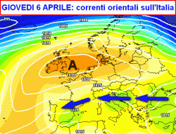 La prima mappa valida per giovedì 6 aprile è molto eloquente e mostra una situazione non molto diversa rispetto all’inverno passato. Un vasto anticiclone ingloberà gran parte dell’Europa centro-settentrionale; sul suo bordo meridionale scorrerà l’aria fresca da est (frecce blu) che dal punto di vista precipitativo farà la felicità di pochi e l’infelicità di molti.