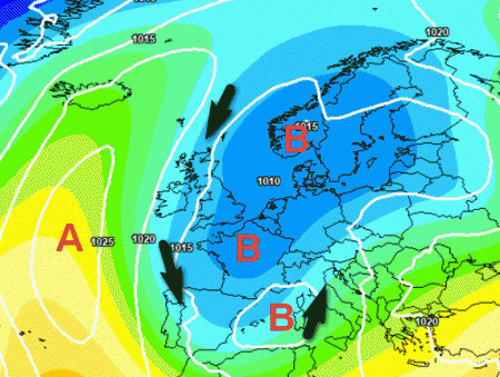 3 l’ipotesi al momento più remota, un’azione perturbata molto a nord e ad ovest del Paese con anticiclone che di sponda rimonta e regala stabilità