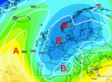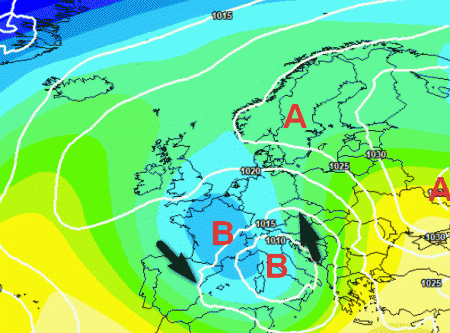 Che cosa si nota da queste mappe? La tendenza dell’anticiclone delle Azzorre a spingersi forse nord sino a fondersi con l’anticiclone russo scandinavo e la tendenza della depressione tra centro Europa ed Italia ed isolarsi sul posto.