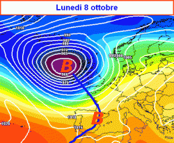 Il tracollo pressorio sui settori nord-occidentali del Continente porterà in grembo una perturbazione che lunedì 8 ottobre sarà distesa come nella seconda mappa.