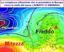 Tre settori europei contraddistinti da un tempo molto diverso; ecco la mappa che riassume come potrebbero disporsi le pedine invernali attorno alla metà di gennaio.