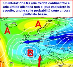 Alcune mappe strizzano l’occhio ad una possibile interazione ovest-est: in altre parole, le correnti umide dall’oceano e quelle fredde dall’Europa orientale potrebbero "parlarsi"; se così avvenisse, l’Italia sarebbe teatro di neve e freddo specie al nord e su parte delle regioni centrali (probabilità al momento bassa, attorno al 30%).