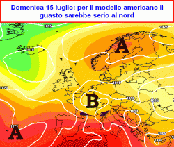 domenica 15 luglio: possibili temporali su tutto il nord, in giornata migliora al nord-ovest ma con deciso calo termico, altrove bello ma nubi in arrivo al centro e primi temporali in Appennino, poi su Toscana, Umbria e medio Adriatico, ancora sole altrove e caldo.
