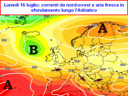 lunedì 16 luglio: instabile su nord-est, medio Adriatico, poi anche Molise e nord Puglia, rovesci sulle zone interne del centro, poi sulla Basilicata e l’Irpinia. Schiarite altrove, ventilato, fresco in arrivo quasi ovunque.