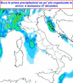 Domenica 27 dicembre: molto nuvoloso e piovoso al nord-ovest e sulle centrali tirreniche con neve oltre i 1200-1300m sulle Alpi, oltre i 1500m in Appennino, peggiora in serata anche sul resto del nord con precipitazioni sparse, specie a ridosso dei rilievi, ancora asciutto su medio Adriatico e meridione, salvo piovaschi in Campania. Lieve calo termico al nord-ovest.