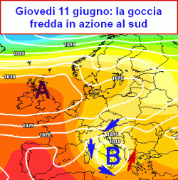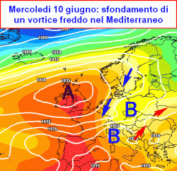 In pratica un vortice freddo riuscirebbe a sfondare da nord-est in Valpadana, scavando un minimo al suolo e attivando temporali anche forti, unitamente ad un netto calo termico. Vortice al suolo e in quota traslerebbero poi verso il centro Italia e infine giovedì 11 anche sul meridione con ulteriori conseguenze