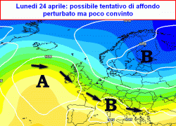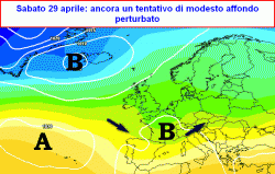 -vi sono segnali di deboli passaggi perturbati tra lunedì 24 e mercoledì 26 aprile e poi ancora tra sabato 29 e domenica 30 aprile