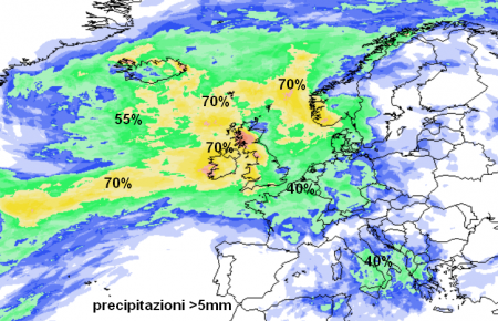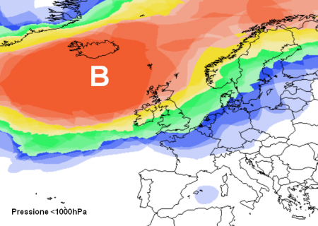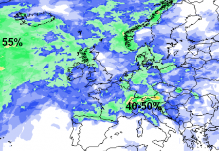 A testimoniare questa distribuzione pressoria che vedrà questo Atlantico burrascoso affacciarsi sul Regno Unito c’è la mappa della probabilità che depressioni inferiori ai 1000hPa siano presenti in Europa e naturalmente proprio per questa fase la percentuale che possa andare davvero così è altissima, come mostra la mappa qui sotto (colorazione rossa):