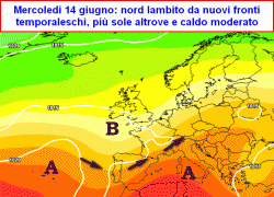 da lunedì 12 a giovedì 15 giugno: progressivamente più soleggiato e caldo, specie al centro-sud e sulle isole, al nord ancora qualche passaggio nuvoloso ma senza risvolti piovosi.